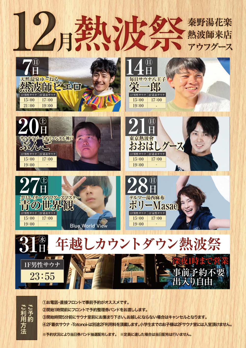 | 2F着衣サウナ Totonoi | 全日:9:00 ~ 23:00 ※1 | |