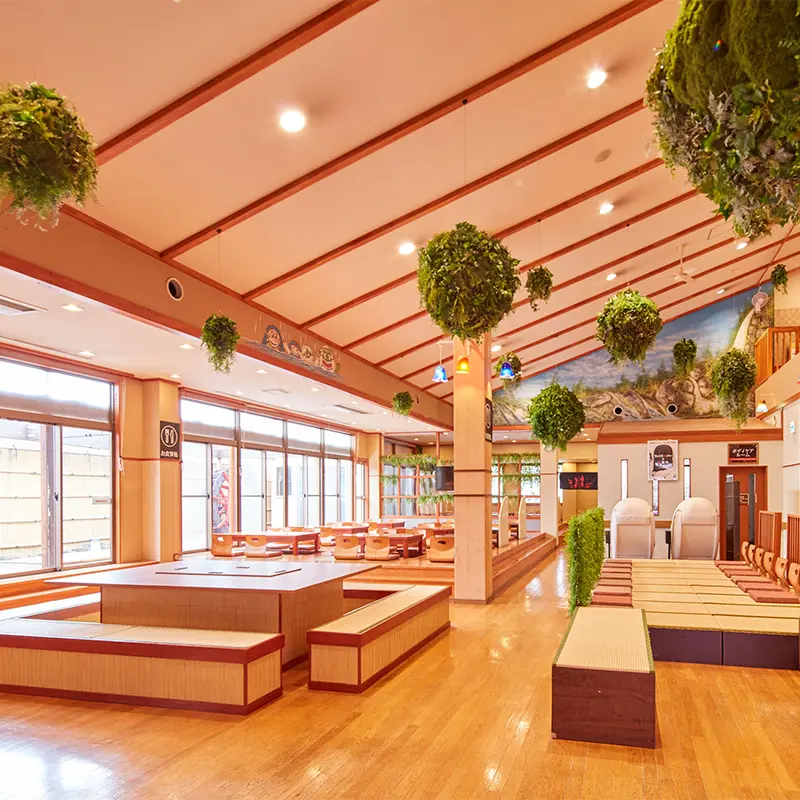 家族団欒やグループでの宴会、お風呂上りの一杯にもどうぞ。和風モダンの雰囲気が楽しい、くつろぎのお食事スペースです。